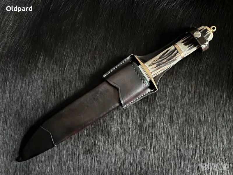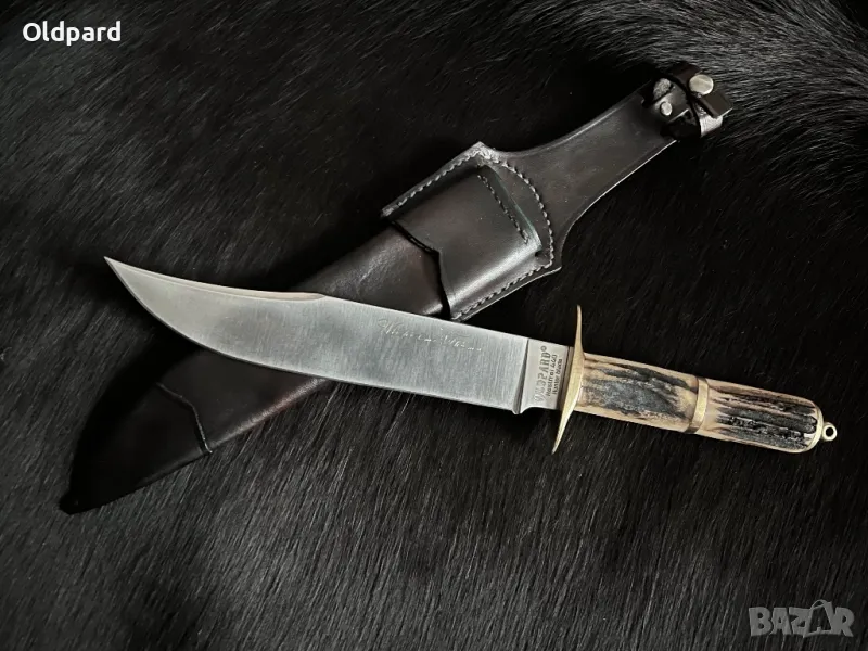 Ловен нож. Bowie острие. Остриета от стомана 440C, дължина 18 см. Дебелина на острието - 4,8 мм. Общата дължина на ножа е 29 см. Дръжката е от рог. Традиционна кожена кания във винтидж стил.