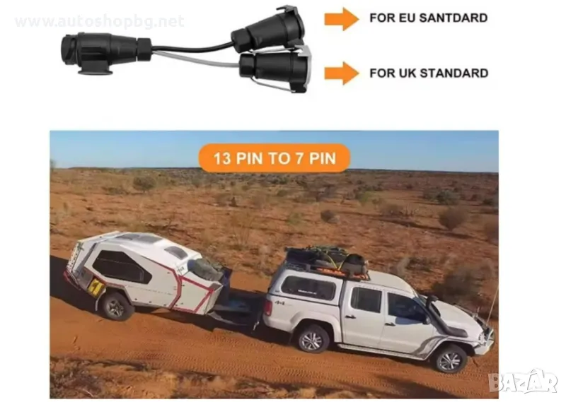 Преобразува 13-изводна букса тип "евро" в двата варианта на 7-пиновата букса, както при повечето каравани и ремаркета.