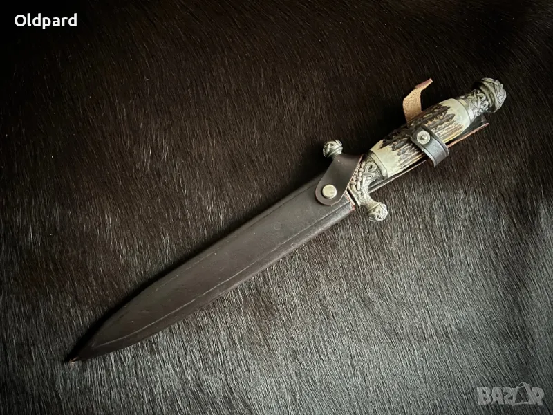 Колекционерска ловна кама. Острие от стомана 440, дължина 21 см. Дебелина на острието - 4.0 мм. Общата дължина на ножа е 33 см. Дръжката е от рог. Традиционна кожена кания във винтидж стил. (D210HC)