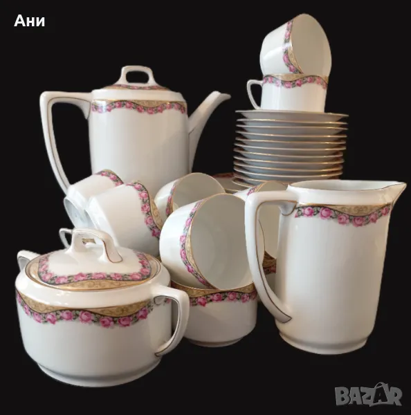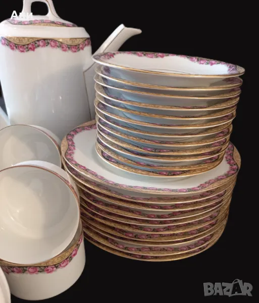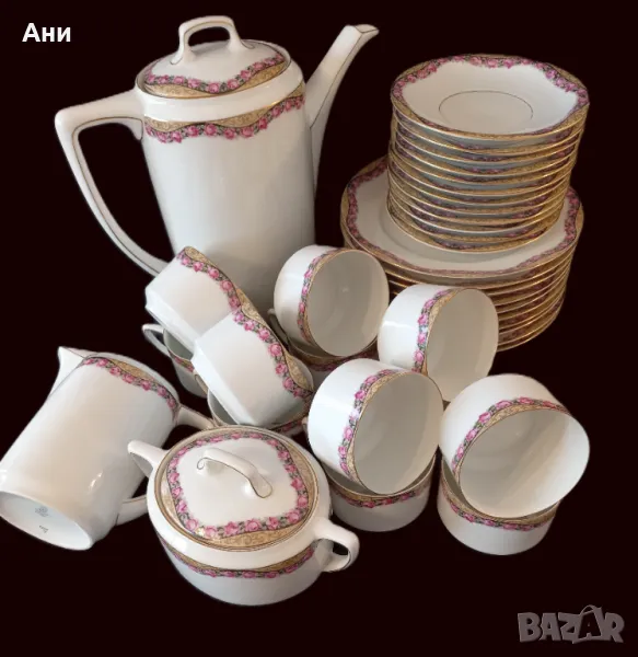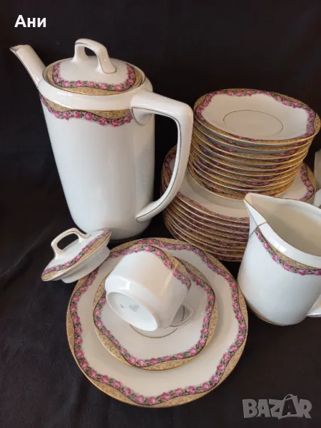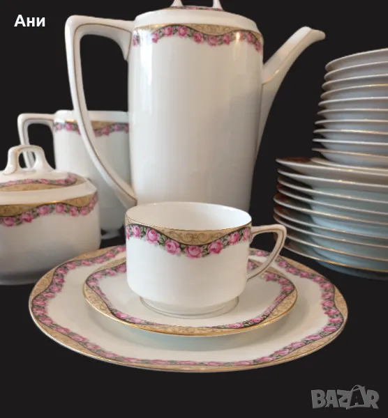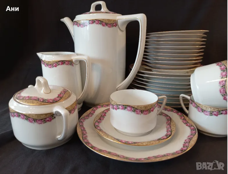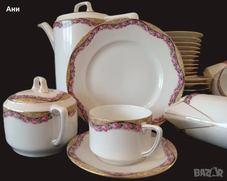 SELTMANN WEIDEN! Сервиз за чай от фин, бял костен порцелан, произведен между 1924 и 1946 г. Декориран е с широк фигурален златен кант, а розите под него следват извивките му, като майски венец.