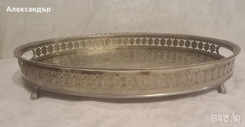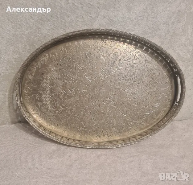 Старинен арабски посребрен сервиз размер на таблата длж 42см. шрн 30см. длб 4см. размер на чайник длж 19см.шрн 12см. красив рядък сервиз с печат