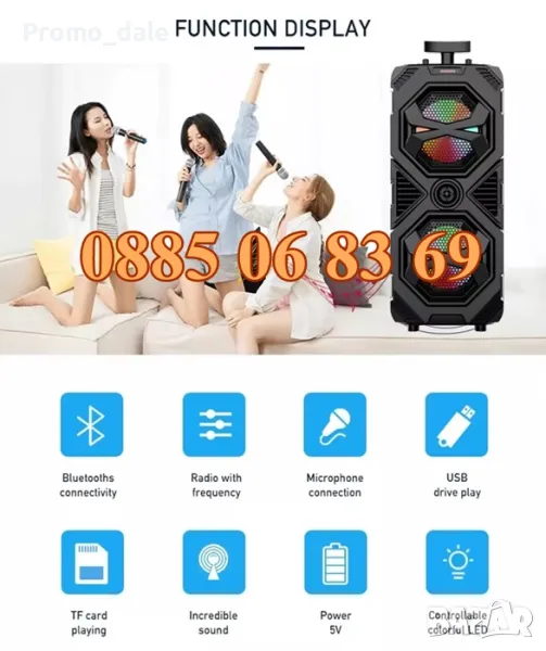 Двойна Караоке тонколона 2х8" ZQS8212, преносима колонка с Bluetooth, радио, микрофон