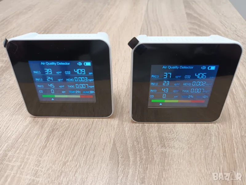 Чисто нов уред за измерване в реално време качеството на въздуха и концентрацията на фини прахови частици: РМ1,0; РМ2,5; РМ10; CO2; TV0C; HCHO; CO; температура и влажност на въздуха. Датчика е изключително прецизен и чувствителен. Има цветна индикаторна скала в зависимост от замърсяването на въздуха, както и звукова и светлинна сигнализация. Уредът може да се зарежда с най-обикновено зарядно за телефон. Уредът е с вградена Li-ion батерия 2000mAh, кабел за зареждане и книжка с инструкции за употреба. Може да се използва в домашни условия, на открити и закрити пространства.
