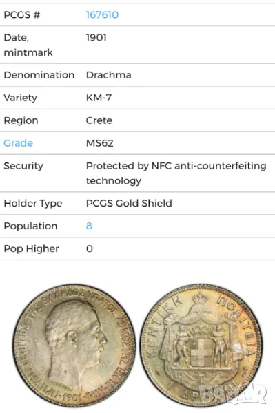 1 драхма 1901 година Крит PCGS MS 62 - Топ грейд → Обява 47985276