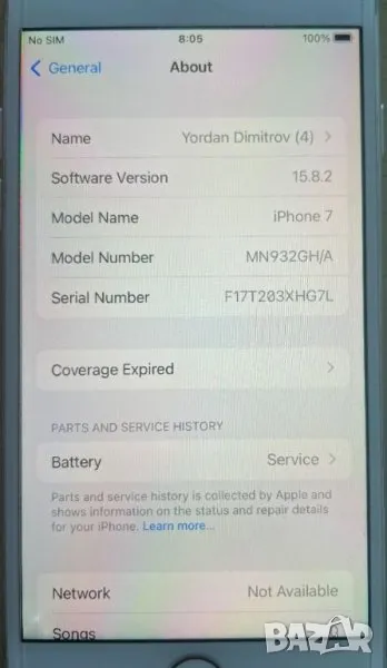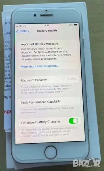 Апарата е АЙФОН 7 128ГБ СИВ/ IPhone 7 128GB SILVER и е заводски отключен към всички оператори. В перфектно техническо състояние 10/10. Визуално състояние 9/10. Подарък нов матов керамичен протектор за екрана. Ъпдейтнат с последна версия на IOS за модела. В комплект е само с кутия без зарядно, кабел и слушалки. Има документ за произход. Жизнените показатели на батерията са снимани. Предлагам и нова батерия + 25лв към цената на апарата.