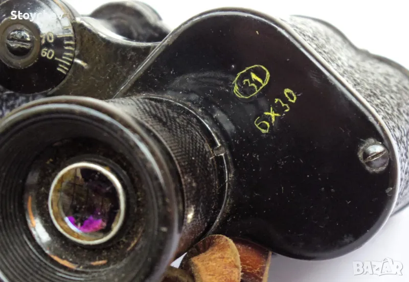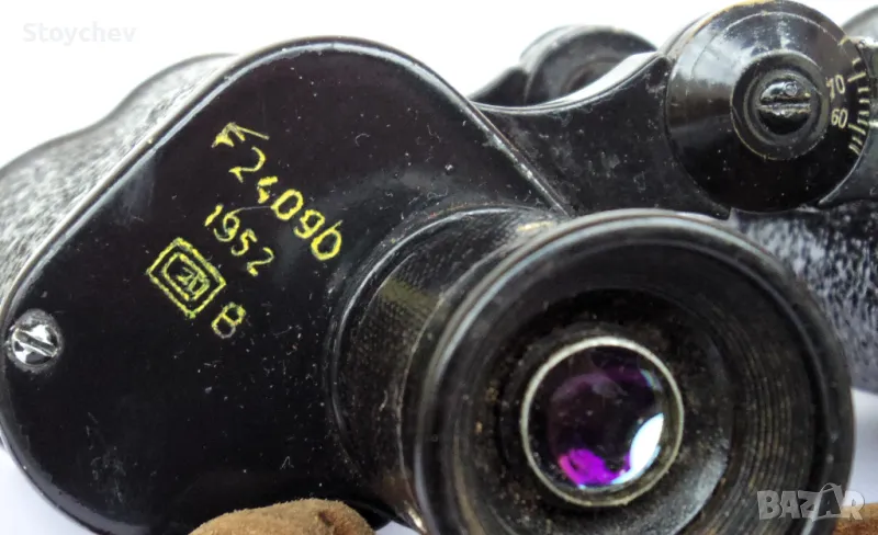 Непрофилактиран. Служебен бинокъл от периода след Втората световна война с далекомерна скала в десния тубус и с извършена реновация в България. Символът 131 е бил въведен в началото на 50-те години като код на военната продукция на PZO - Polskie Zakłady Optyczne. Годината 1952-а на лявата окулярна призмена плоча най-вероятно е годината на производство на уреда. Символът В до 20-ца в два правоъгълника е вида на използваната смазка. Много добро състояние, запазен корпус, цели наочници, здрави лещи и призми с незначителни забележки, работеща индивидуална фокусировка. Поле на видимост 150 на 1000 м., тегло 614 гр. Окомплектовка: кожен презвратен ремък и кожен дъждевик. 160 лева.
