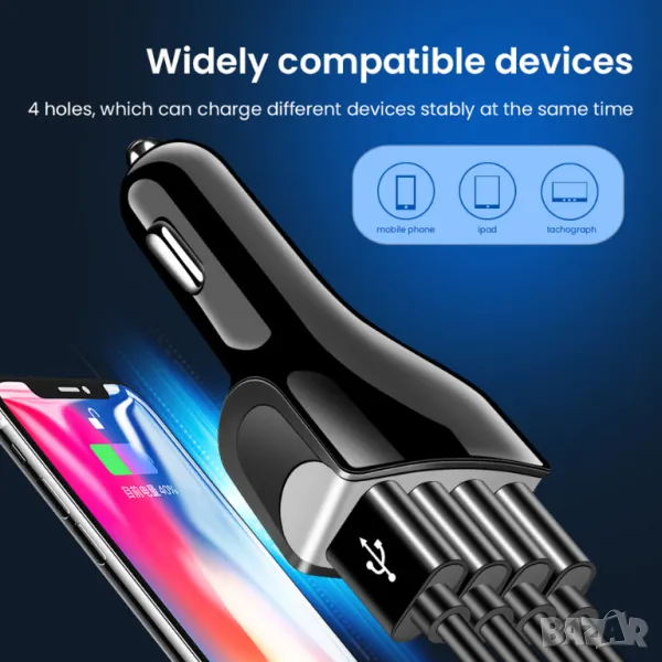 зареждате до 4 устройства едновременно. Захранващото му напрежение е 12-24VDC и