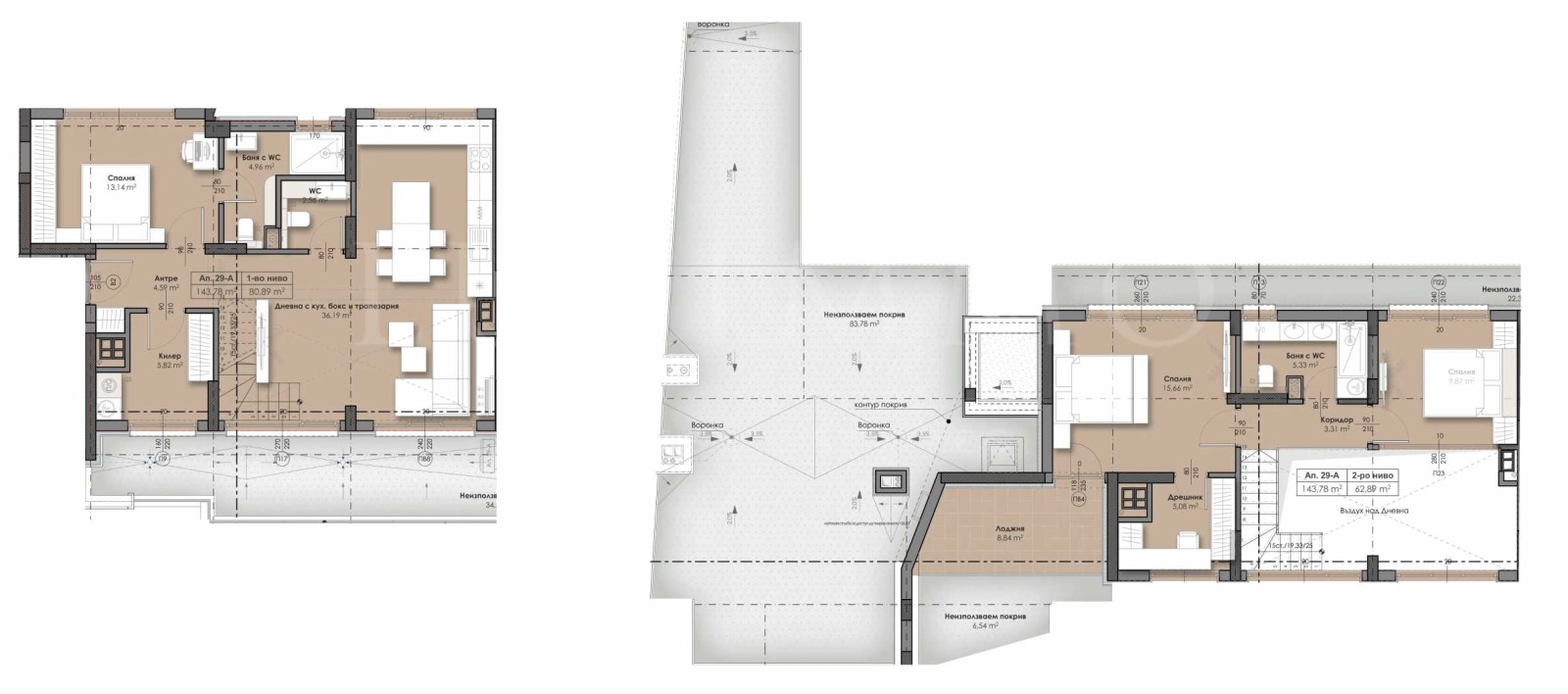 второ ниво: коридор, две спални, дрешник, баня с тоалет, лоджия.