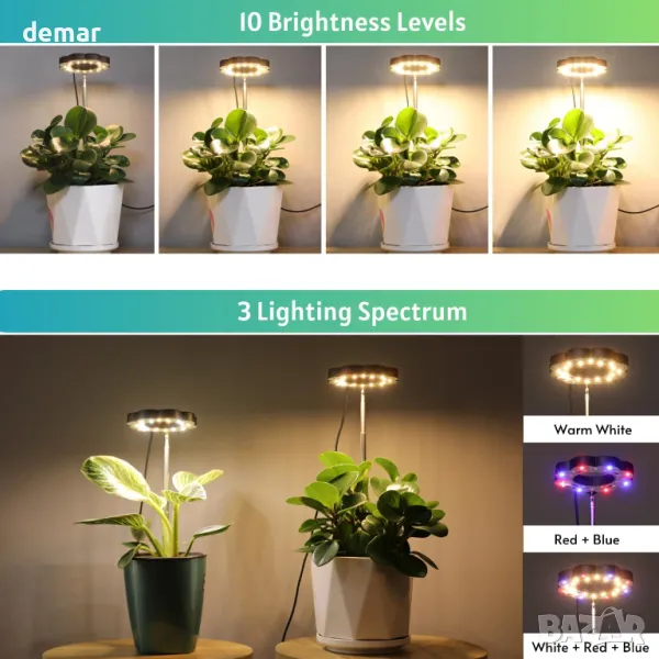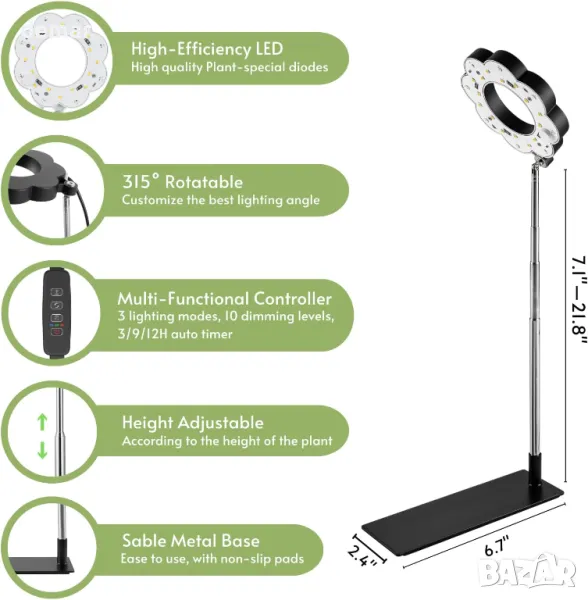 Лампите за стайни растения FANHAO предлагат универсален дизайн с подвижна метална основа с нехлъзгащи се подложки за стабилност или можете да поставите пръта директно в почвата. Компактният му размер го прави идеален за малки пространства като маси, рафтове или ъгли. Оборудван със светодиоди с пълен спектър, той имитира естествената слънчева светлина с дължини на вълните от 380nm до 780nm и предлага три режима на осветяване за подпомагане на растежа на растенията през различни етапи. Вграденият таймер за цикъл (3H/9H/12H) осигурява постоянно ежедневно осветление, дори когато сте далеч, докато 10 регулируеми нива на яркост и въртяща се на 315° тръба ви позволяват да персонализирате интензитета и посоката въз основа на нуждите на вашите растения . Тази светлина не само насърчава здравословния растеж, но и озарява вътрешните пространства.