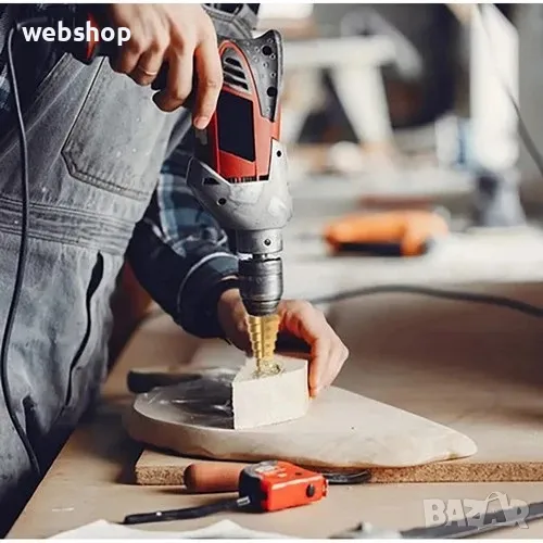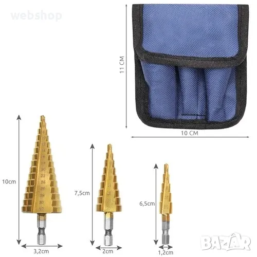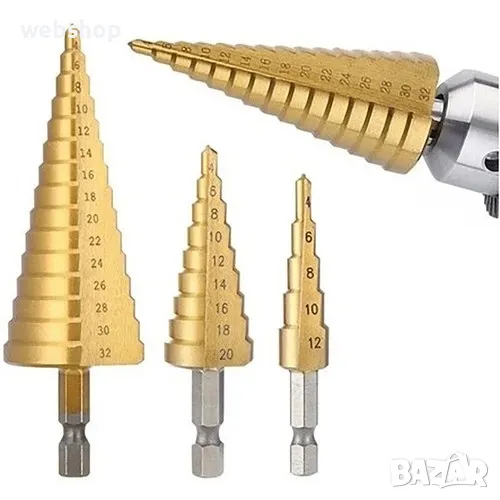 Комплект конусовидни стъпкови свредла за прецизно пробиване на кръгли дупки в тънкостенни стоманени листове, пластмаси, металообработване и др. Стъпковите свредла ще намерят приложение в шлосерството, тенекеджийството, инсталацията, както и в домашната работилница за дребни работи.
