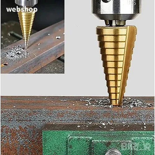 - HHS СТОМАНА - ТИТАНОВО ПОКРИТИЕ – нашите конусовидни свредла са издръжливи, изработени са от високоскоростно режеща, устойчива и издръжлива HHS стомана, благодарение на което са идеални за пробиване на отвори, напр. в PVC, тънкостенни листове и дори в метал. НЕ изискват предварително наточване.