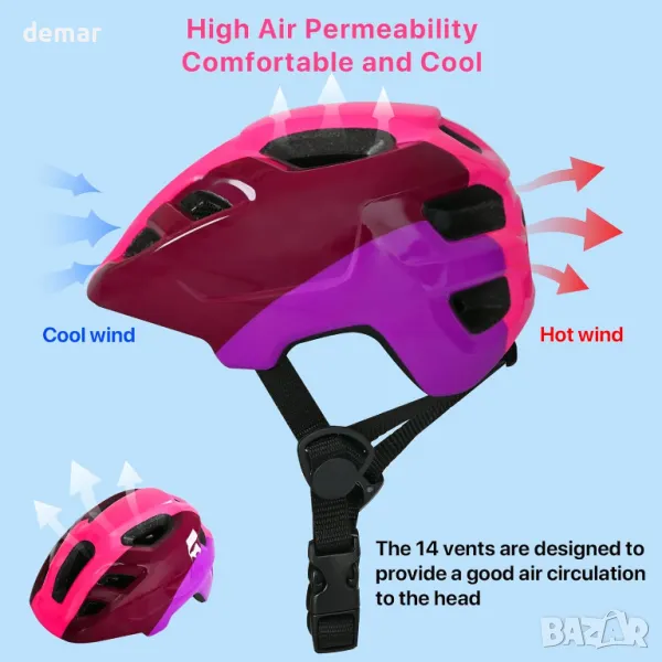 Тази детска и младежка велосипедна каска отговаря на стандартите на ЕС CE, включваща издръжлива PC външна обвивка и лека EPS пяна за абсорбиране на удари и минимизиране на удара. Проектиран с 14 вентилационни отвора, той осигурява оптимален въздушен поток за прохладен комфорт по време на колоездене или планинско каране. Шлемът включва подвижни, миещи се гъбени подложки за лесна поддръжка и регулируемо прилягане за растящи деца, което гарантира комфорт и безопасност. Идеален за колоездене, скейтборд, ролери и много други, той е универсален и подходящ за момчета и момичета, което го прави подходящ подарък за различни поводи.