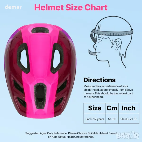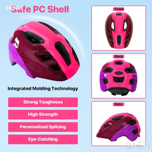 Детска каска, CE EN Сертифицирана, възраст 5-12 години, регулируема, 51-55 см, лилаво+розово