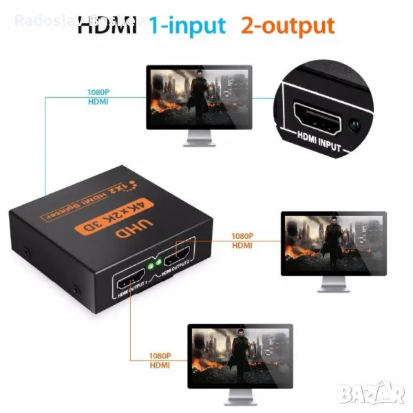HDMI сплитер с 1 вход и 2 изхода, който позволява едновременно предаване