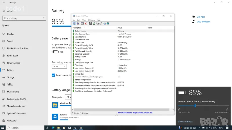 БАТЕРИЯ - HP 3-cell Long Life Polymer Battery (50 WHr) с издръжливост над 5-6 часа в зависимост от настройки и натоварване.