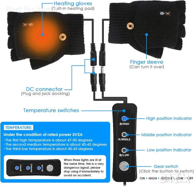 【3 НИВА НА ТЕМПЕРАТУРА】 - Отоплителните ръкавици са с лесен достъп и USB 5V захранване, удобни и практични. 3 регулируеми нива на температура: Режим на висока температура: 47~ 55°C; Средна температура: 43~ 47°C; Режим на ниска топлина: 40~ 45°C.