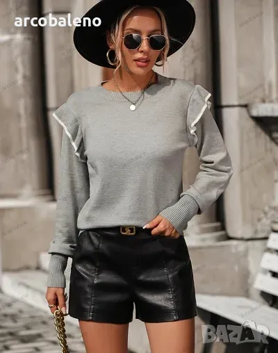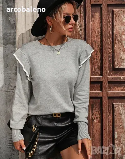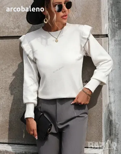 Дамски свободен едноцветен пуловер с кръгло деколте и волани, 4цвята