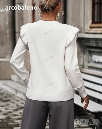 Нов дамски плетен пуловер с волани Свободен едноцветен пуловер с кръгло деколте Моден пуловер е подходящ за много поводи, простият дизайн прави скучния сезон цветен и интересен. Разнообразието от опции за колокация ви прави уверени и красиви. Моля, използвайте ръководството за размери, показано на нашите изображения. Моля, прочетете внимателно всеки елемент в ръководството за размер, преди да изберете размер. Размерът се измерва ръчно, като е нормално да има грешка от 1-3см.
