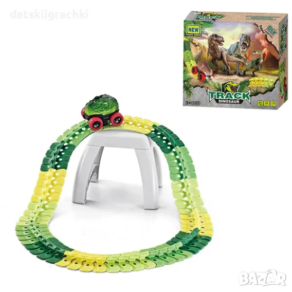 Комплектът съдържа:- кола с купе с формата на глава на динозавър с цвят зелен,- второ купе за колата във формата на глава на динозавър с цвят кафяв, което можете лесно да смените,- пластмасови елементи за сглобяване на път.Гъвкавите части дават възможност да се сглоби път с различни форми. Заредете колата с 3 батерии от 1.5 V size AAА.
