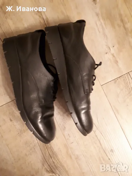 Продавам черни обувки естествена кожа,с връзки, запазени, без забележки, подметката е платформа. Обувките са удобни за ежедневно ползване.