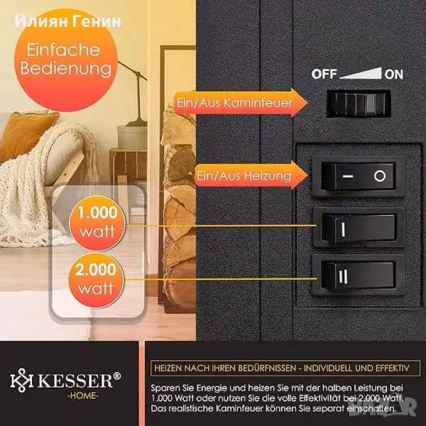 Електрическата камина с мощност 2000 W осигурява романтична атмосфера във вашия хол. Има две регулируеми настройки на топлината (1000 вата и 2000 вата). В допълнение към ефектите на камината, можете лесно да отоплявате хола си.