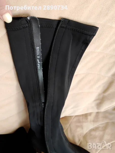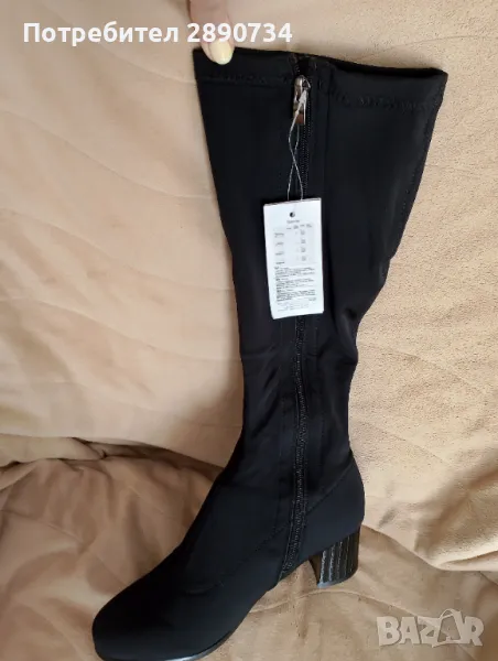 Съвсем нови елегантни ботуши от еластична материя до коляното с близо 6-сантиметрово токче.