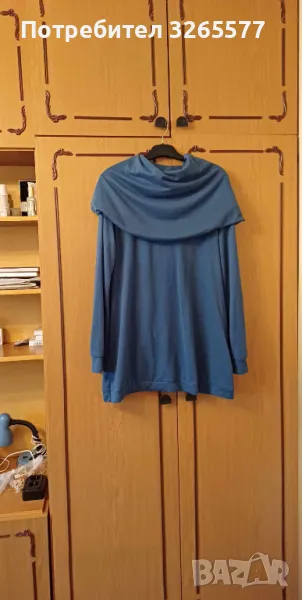 Продавам блузон с голяма яка в два цвята - синьо и черно. Може и като рокля да се ползва.Яката може да се нагласява по ваш вкус.Размера е 3 пъти XXXL. Гръдна обиколка - 106см, дължина - 84см.Закупена е от Лондон.