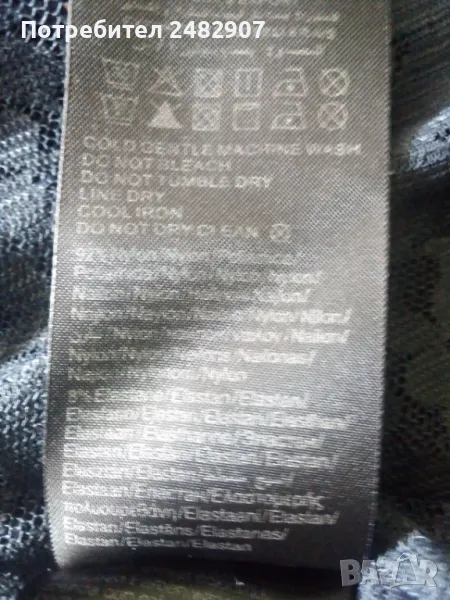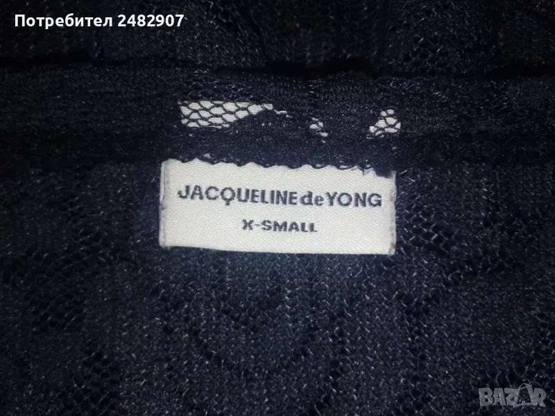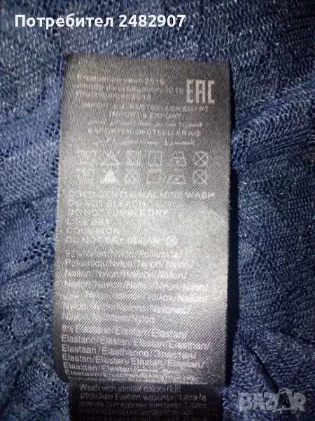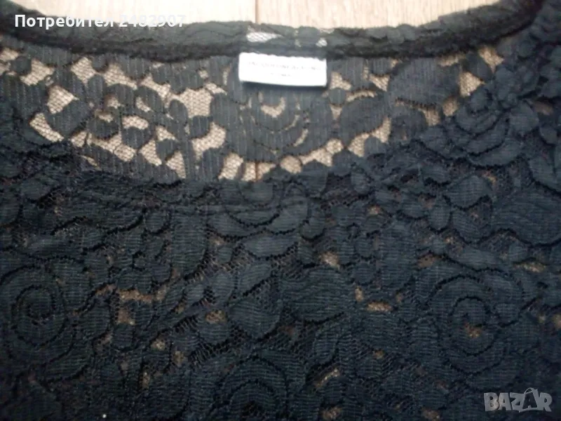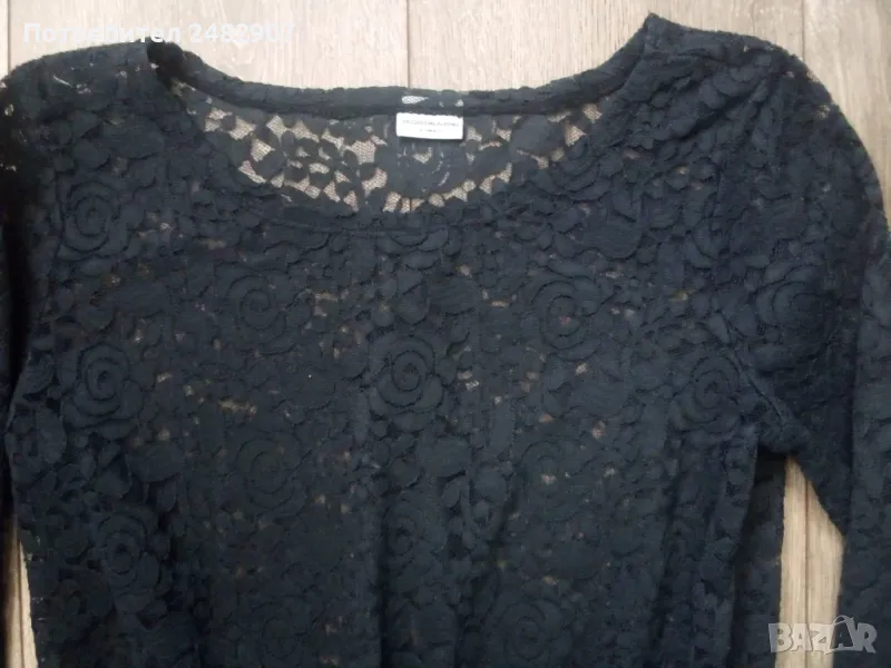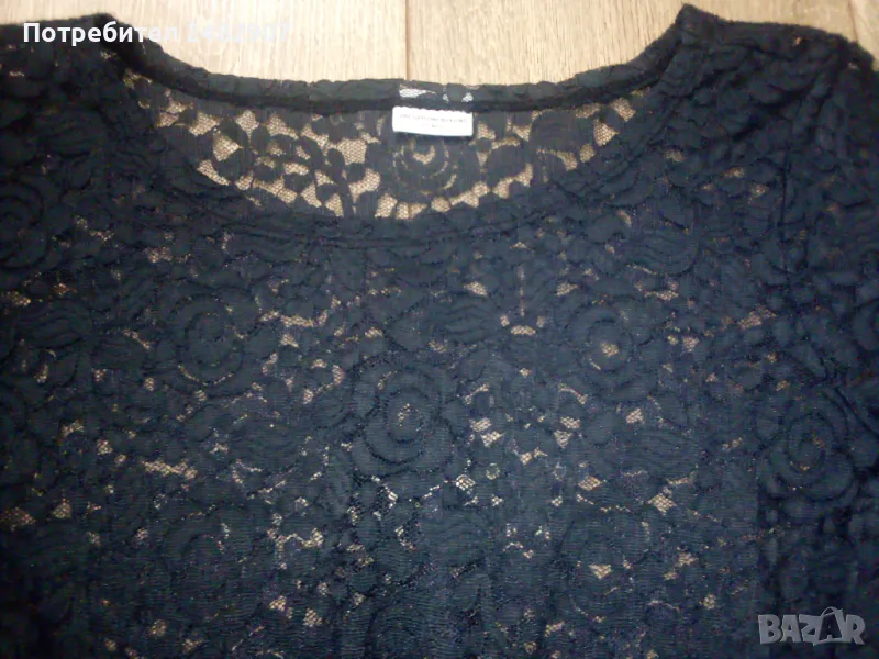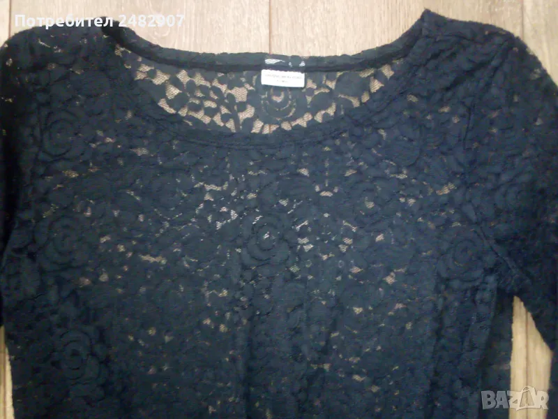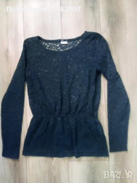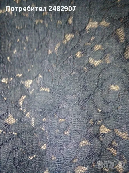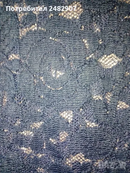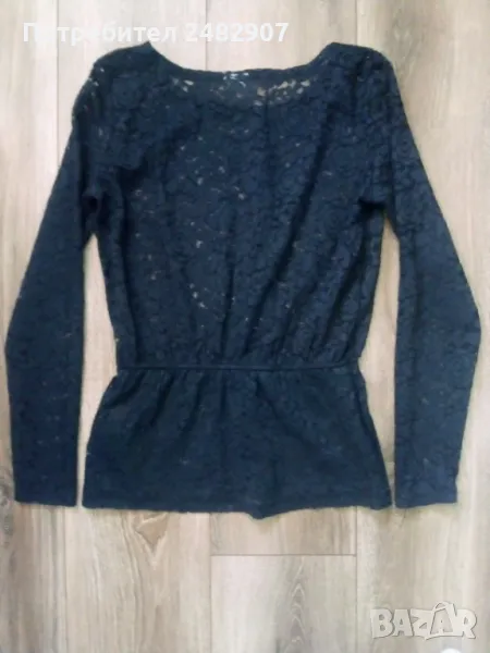 Тъмно синя дамска блуза от красива дантела. Съдържа 92 % найлон и 8 % еластан. Ширина в раменете - 36 см, ширина под мишниците - 45 см, ширина в долната част - 48 см, дължина от рамото до долу - 60 см, дължина на ръкава от рамото - 59,5 см, ширина на ръкава в долната част - 8,5 см. Много запазена, почти не е използвана, леко еластична, с ластик в талията.