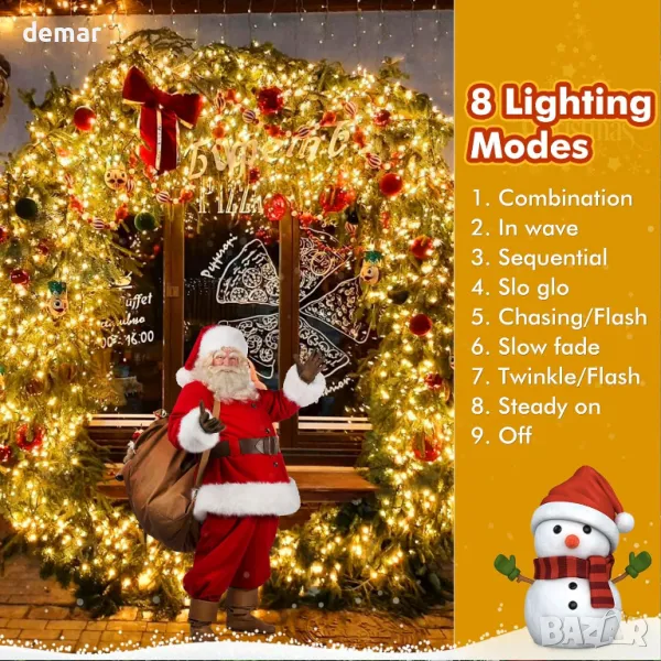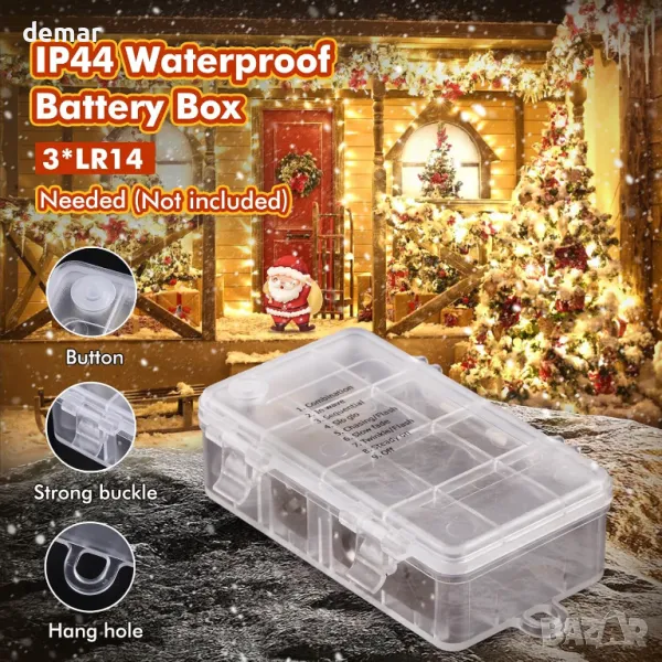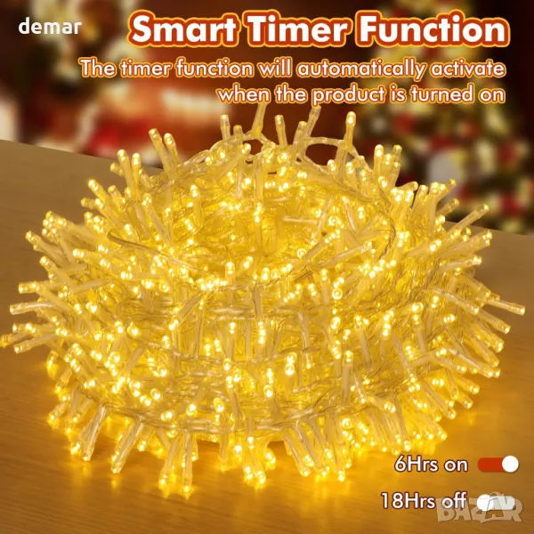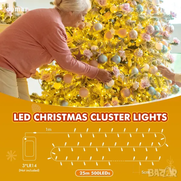 Осветете вашето пространство с 500 топли бели LED светлини, работещи с батерии, идеални за коледни елхи и разнообразни декорации. Раздалечени на 5 см на 25 м дължина с допълнителен 1 м удължителен проводник, те предлагат плътен, лъчист дисплей. Захранвани от 3 батерии LR14 (не са включени), светлините разполагат с енергоспестяващ таймер (6 часа включени, 18 часа изключени) и 8 режима на светене с функция за памет, за да запазите последната си настройка. Проектиран за удобство, комплектът включва колело за съхранение и 25 връзки с цип за безпроблемно инсталиране. Подходящи за вътрешна и външна употреба, тези светлини с рейтинг IP44 са идеални за празничен декор, партита и сватби.