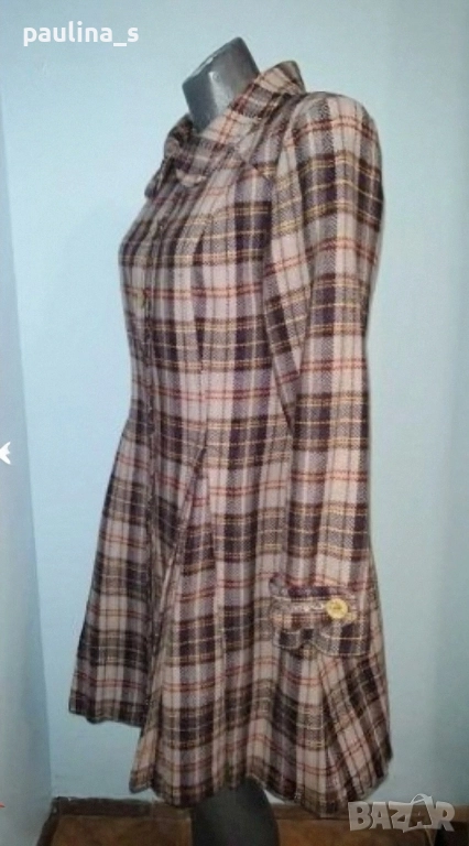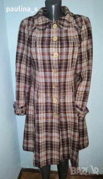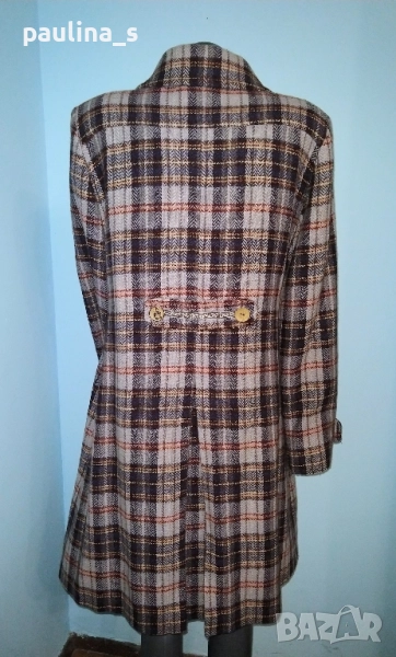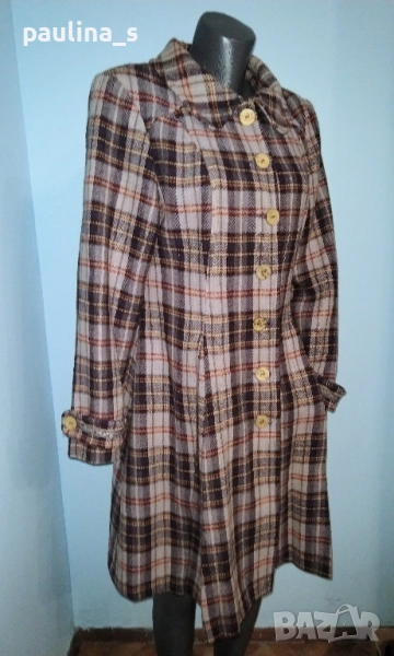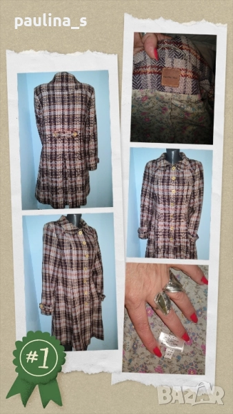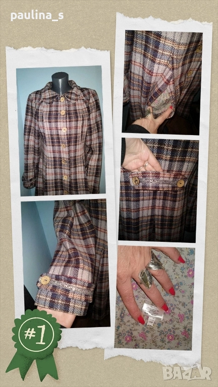 2️⃣. Колаж / L / XL - Винтидж! "container". Цената е крайна, без пазарлъци 129,99лв / 65 евро. Палто бутикова селекция от вълна, мохер и примеси. Десенът е в Аметист каре, моделът е втален с разкроена долна част и скрити джобове. Копчетата са уникални, допълните декорации с рюшове са изумителни. Дрехата е много впечатлителна и елегантна. Хастарът е весело Флорално разкошество към дрехата.