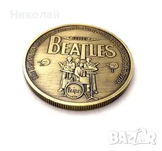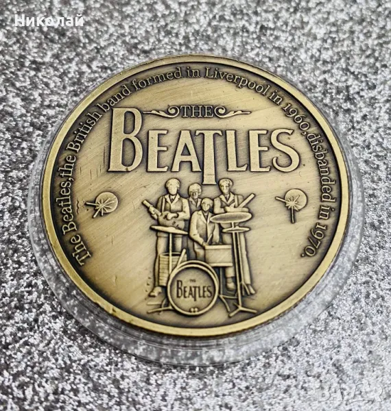 Сувенирна монета на рок групата Бийтълс в предпазна капсула. От предната страна са изобразени членовете на групата, както паметникът в Лилърпул. Джон Ленън, Пол Макартни, Джордж Харисън, Ринго Стар