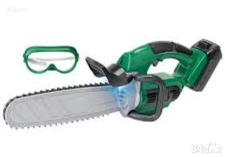 Комплектът включва моторен трион с въртяща се верига, който издава реалистичен звук, а за да е напълно безопасно и реалистично в него са включени и предпазни очила.