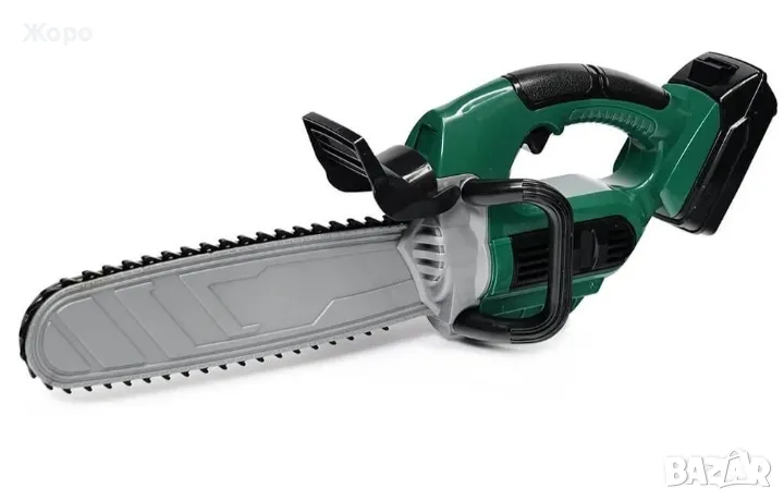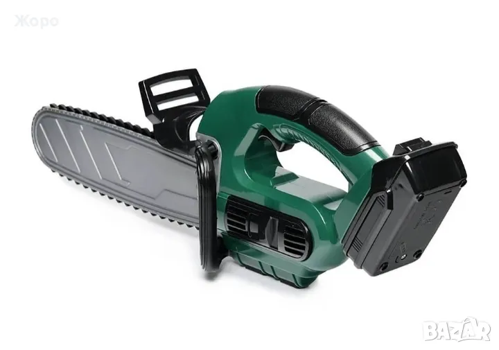 Моторният трион има реалистични звуци на двигателя и движеща се пластмасова верига.