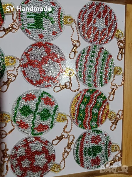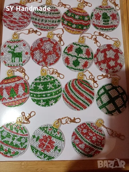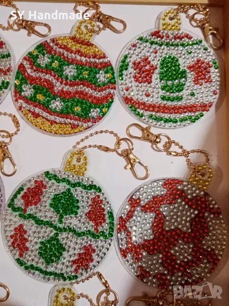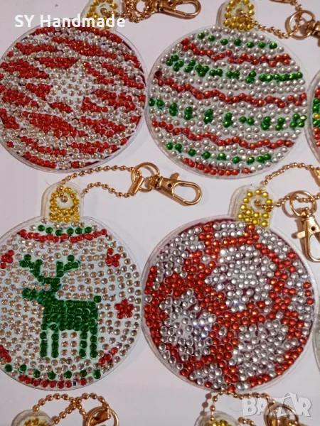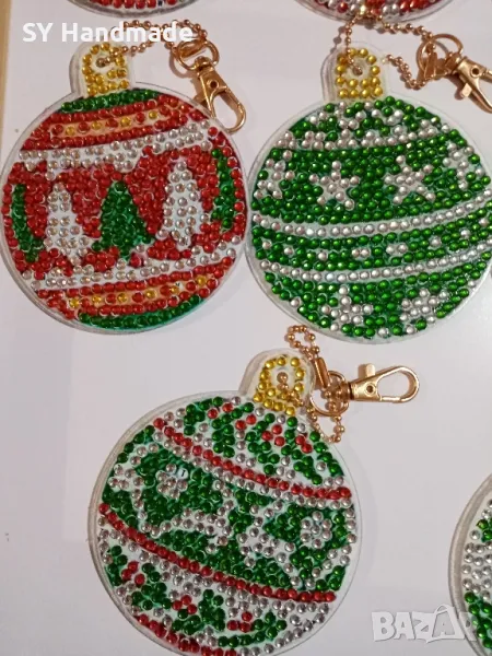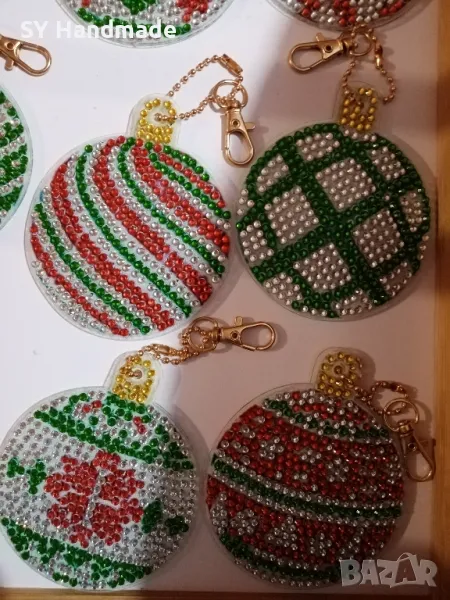 Чудесен подарък за колеги, приятели и роднини. Диамантените топки могат да се използват освен за украса така и като аксесор в ежедневието. Фигурите са ръчно украсени. Могат да се закупят на бройка с цена от 3 лв.