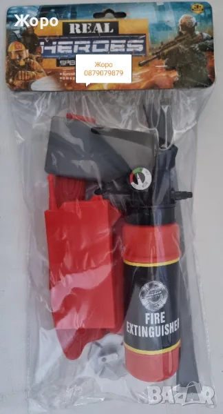 - Пожарникарският комплект включва всички необходими инструменти, използвани от истинските спасители - пожарогасител, уоки-токи, чук,