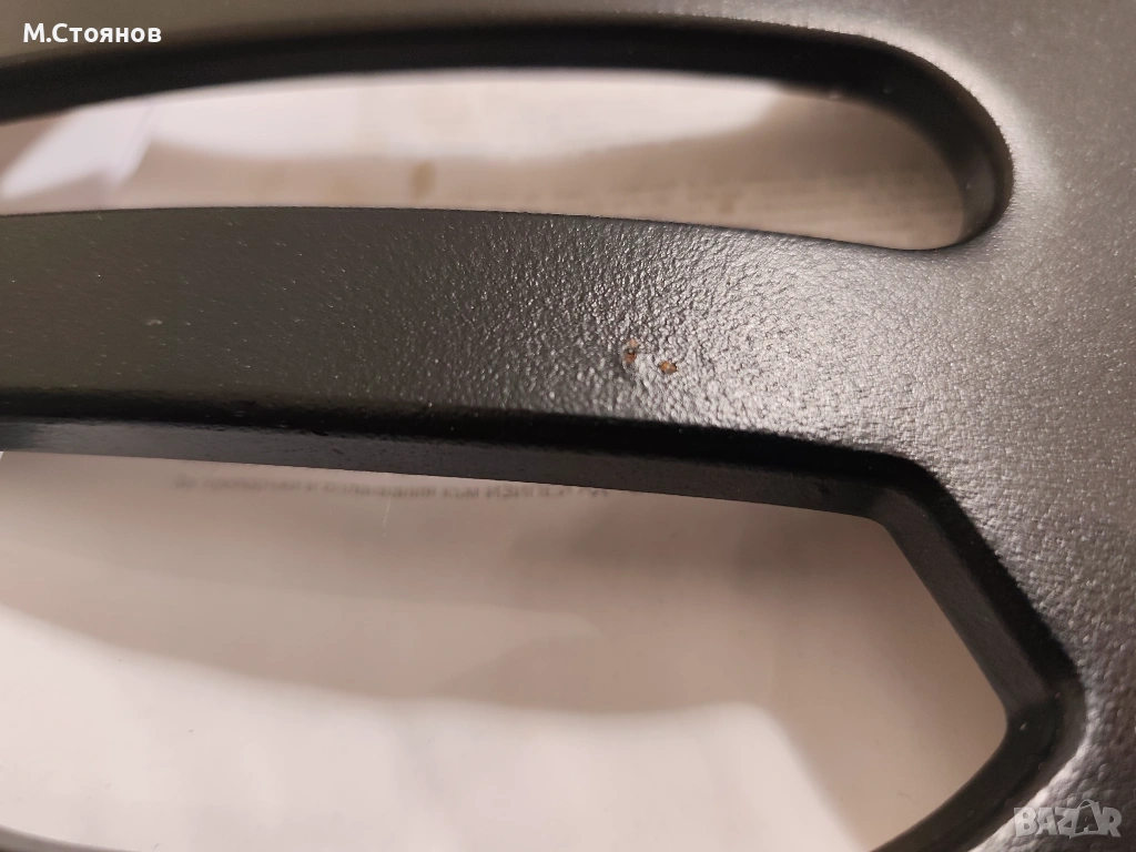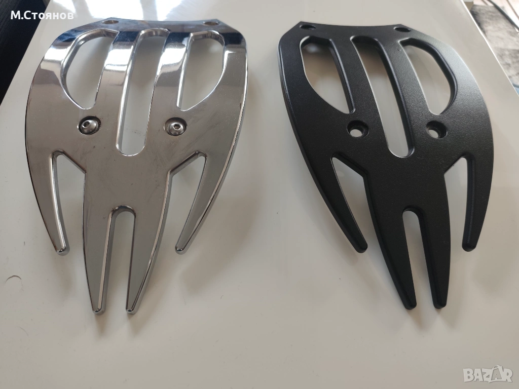 Черния е матов не е ползван за съжаление има 2 малки несъвършенства по боята. Не съм го пребоядисвал така го извадих нов от опаковката. Снимал съм ги забележките. Хромирания съм го слагал няколко пъти. Купих ги с голям мерак, но се оказа, че ще возя често. Мотора вече го продадох и не ми трябват.