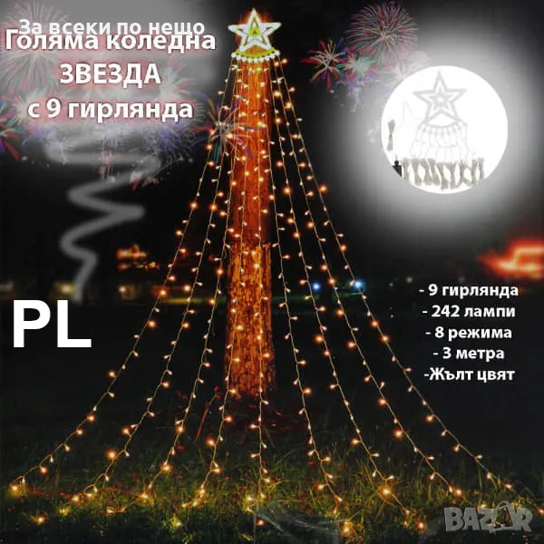Голяма коледна ЗВЕЗДА с 9 гирлянда за елха или градинска украса, 242 лампи, с няколко режима на работа и дистанционно управление.