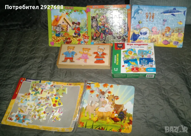 Снимка 7 и 8- дървени мечета за обличане, картонена игра за шиене, картонени пъзели=20 лв