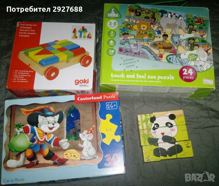 Снимка 9 и 10- дървени кубчета, дървена количка конструктор, голям пъзел с тактилни елементи=30 лв