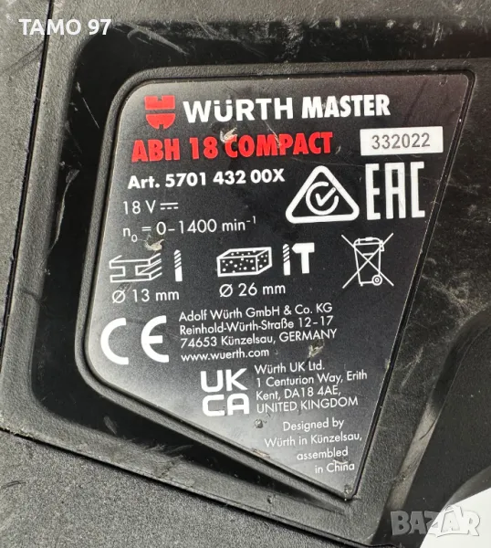 1. Безчетков перфоратор: Wurth ABH 18 Compact Напрежение на мотора: 18V