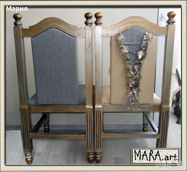 Столове орехов масив, кожена тапицерия, без забележки. 5 броя, 2 в сребристо, 3 в златисто. Цена за брой.