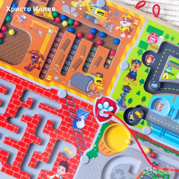 Използвайте прикрепената магнитна пръчица, за да местите парчетата през четири уникални самостоятелни лабиринта: броене на строежи, състезателна писта Adventure Bay, забавление в Пожарната и Рециклиране.