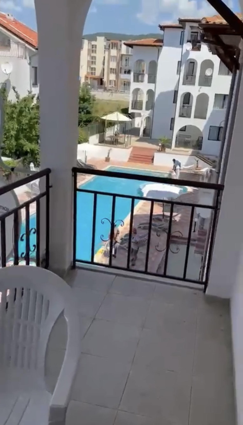 Апартамента е разположен е на 2 жилищен етаж. Състои се от антре, хол две спални, баня с тоалетна, и балкон с гледка към басейна.Всичките мебели в апартамента са качествени и запазени! Имотът е подходящ за целогодишно ползване, както и за отдаване под наем през летният сезон.Такса поддръжка 6 евро.