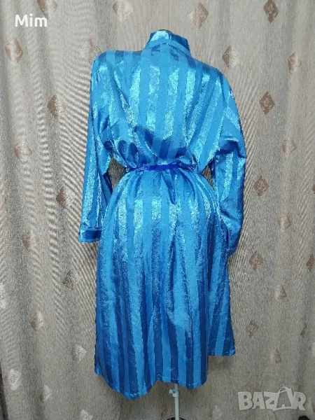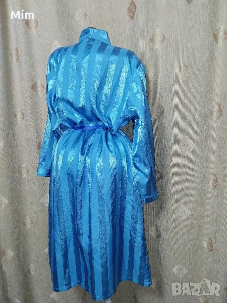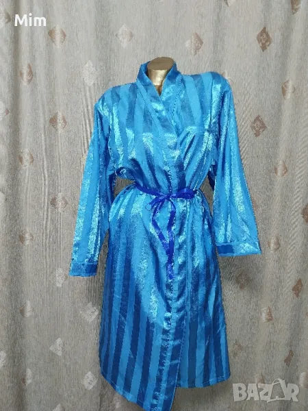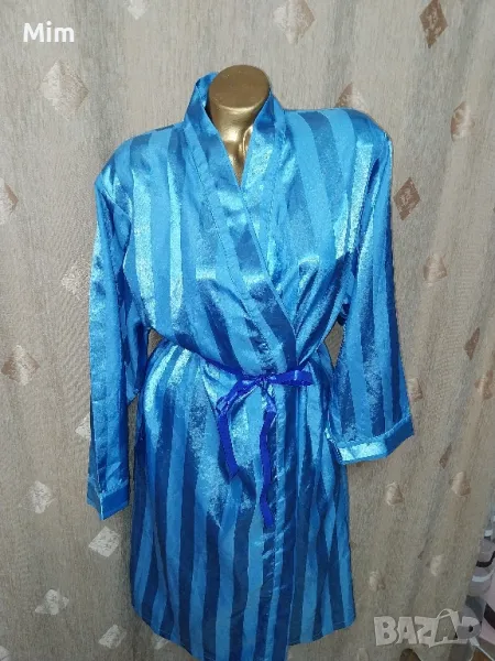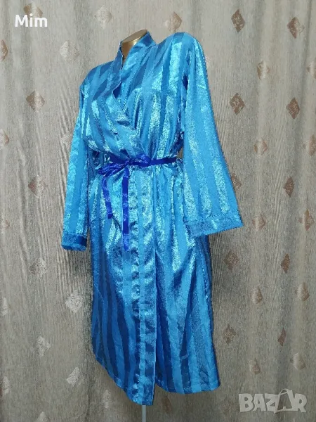 Син сатенен халат, с дълъг ръкав, с премятане завързва се с колан ,по етикет е М но според размера в см маже да се ползва и за по голям размер, гръдна 61 см едностранно, ханш 67 см едностранно, дължина 115 см ,дължина на ръкавите 54 см ,странично с два вътрешни джоба. Няма забележки.