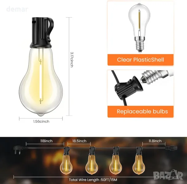 Външни светлини Bestendony Водоустойчиви, 15M гирляндни светлини с 26 нечупливи крушки (1 резервна)