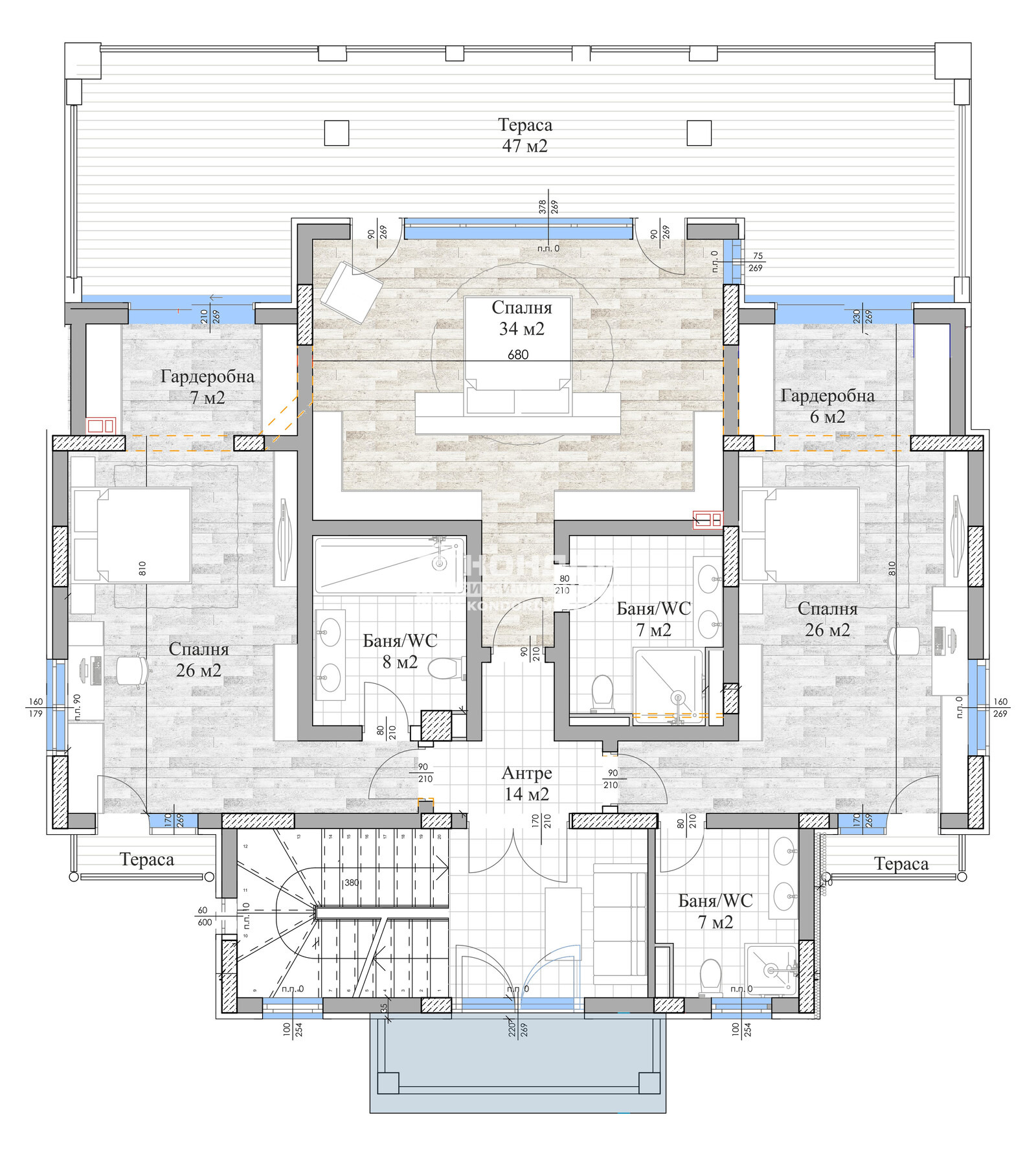 Второ ниво: Огромна дневна с трапезария и кухненска част, спалния с гардеробна и тераса 50 кв. м.