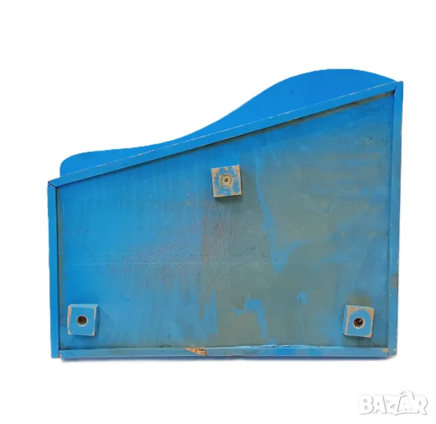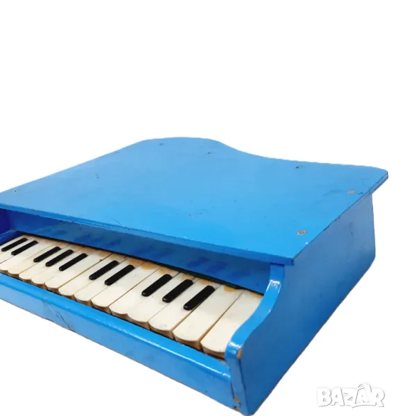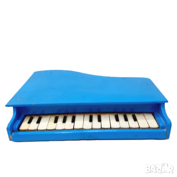 Ретро играчка - пиано, в светло син цвят. Има проста, правоъгълна форма с леко извита горна част и традиционна клавиатурна подредба. Клавишите са комбинация от бяло и черно, наподобяващи миниатюрна версия на истинско пиано. Тази играчка пиано изглежда е направена от дърво и има някои признаци на износване, което показва възрастта му. Размерите му са 38 см дължина, 30 см ширина и 7 см височина, с тегло 1,750 кг. Това пиано би било очарователна музикална играчка, която децата да учат и да свирят музика.