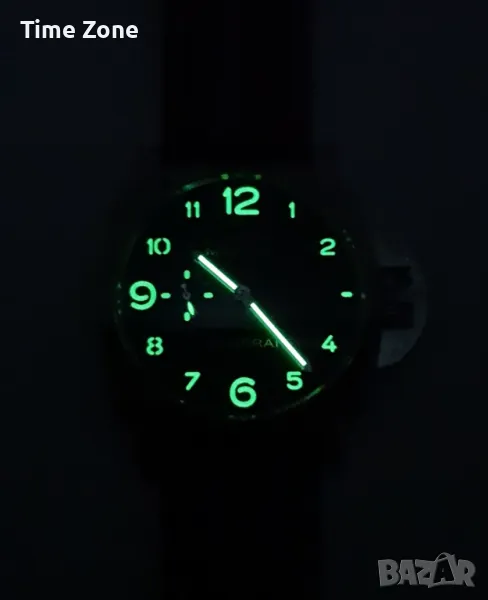 - Циферблат: Черен мат, двуслоен тип "сандвич", кремави (винтидж) стрелки и часови маркери с ярка луминесценция