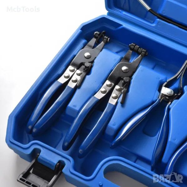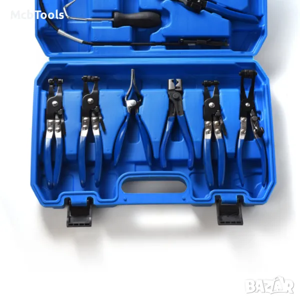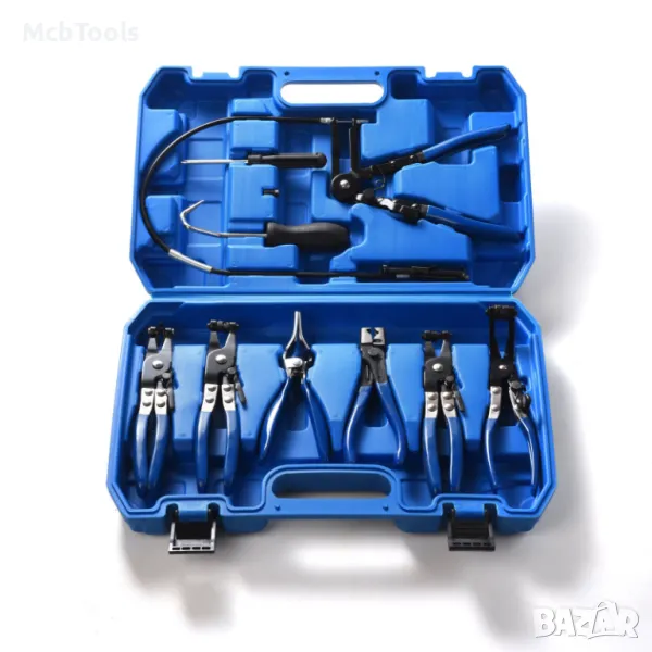Универсален комплект, който може да се използва във всяка ситуация. Незаменим при работа с тръбопроводи и маркучи в автомобилни двигатели. Повечето от тях са закрепени със скоби и скоби. Клещите улесняват разглобяването.