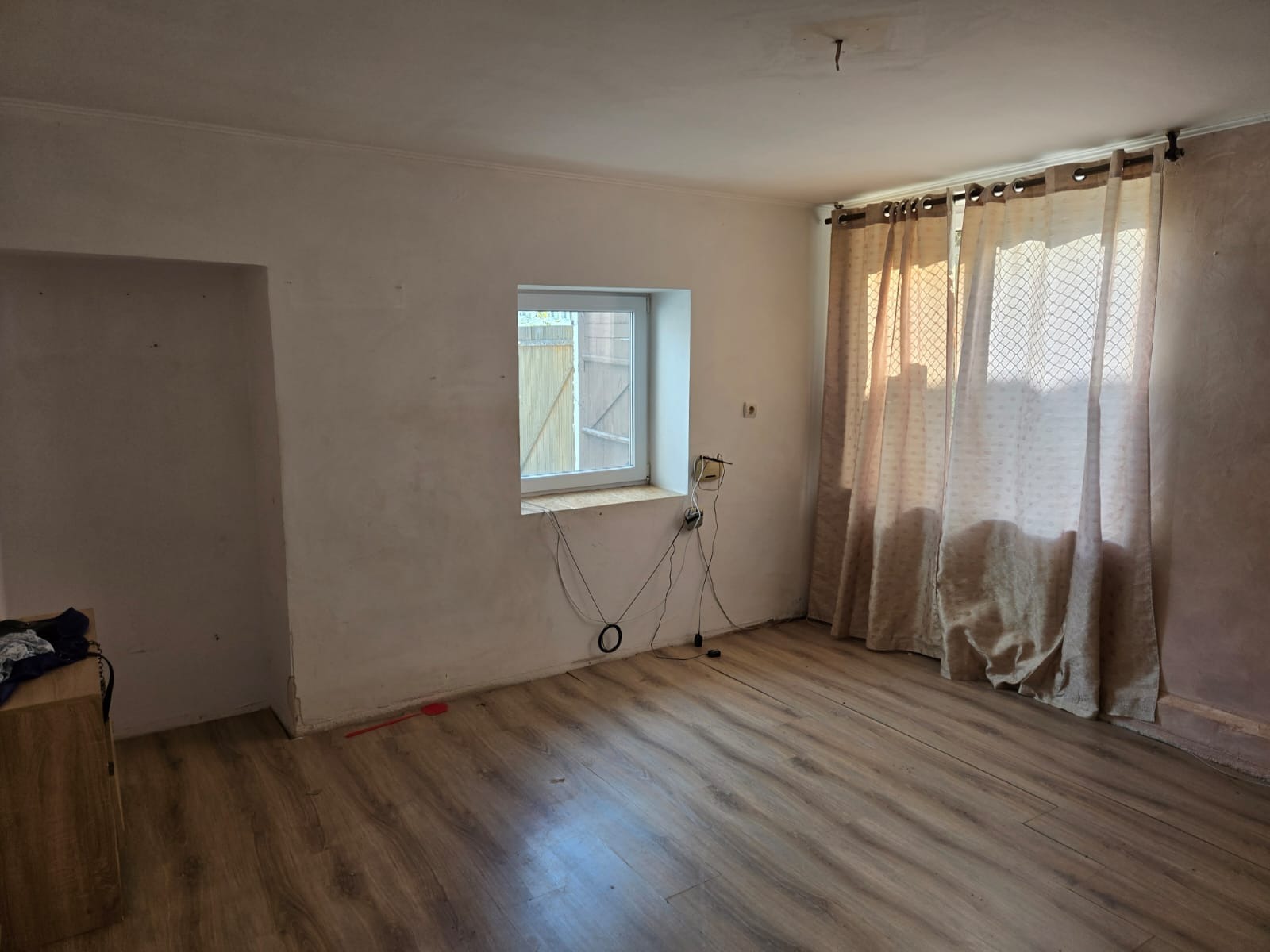 На първият етаж е ситуирана всекидневна с кухненски бокс, антре, баня с тоалетна; на вторият етаж са две спални, с антре. Ремонтиран покрив, нова дограма, нов ВИК и ел. инсталация, СОТ. Дворът е 320 кв.м, с техническа постройка, беседка, овощни дръвчета.